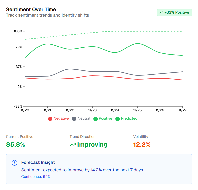 Track brand mentions, sentiment, and protect reputation across all channels in real-time. Get comprehensive visibility with unified monitoring spanning social media, news outlets, blogs, forums, and audio broadcasts. Track sentiment evolution, identify top media sources, analyze complaints and praise themes, and benchmark against competitors with automated reports.