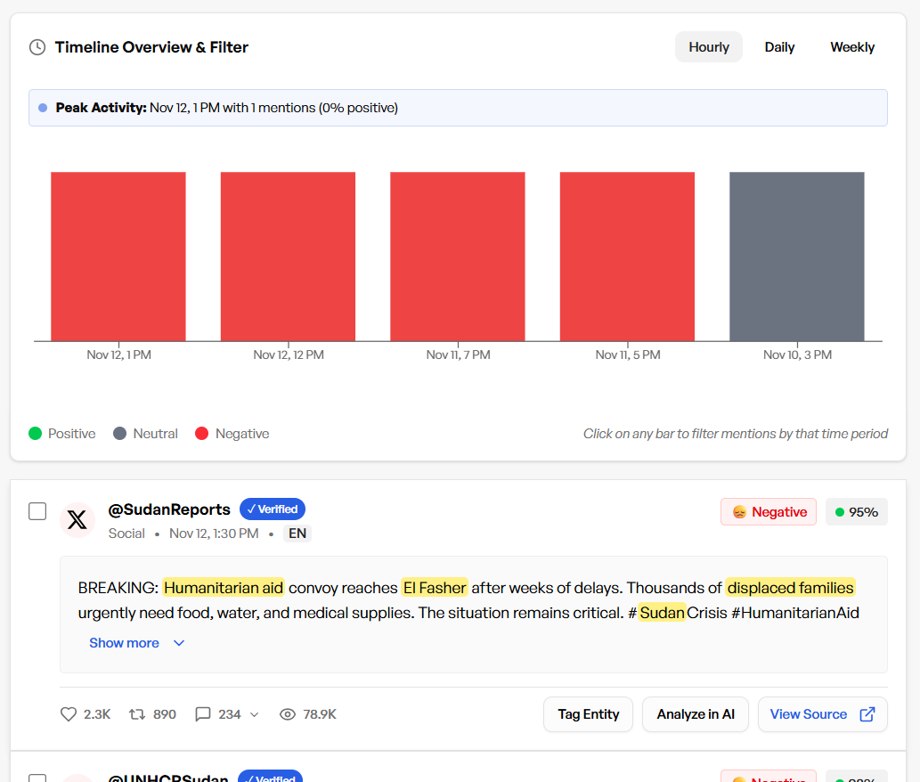 Emerging crises develop rapidly across radio broadcasts, social media, and local news. You need real-time detection before situations escalate.